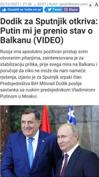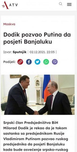 Vijest da su se u Moskvi danas sastali Milorad Dodik i ruski predsjednik Vladimir Putin objavili su RTRS i ATV, a iako su njihove novinarske ekipe u Moskvi sa kamerama i fotoaparatima, niko nije uspio da napravi bar jedan kadar od par sekundi sastanka ili jednu njihovu zajedničku fotografiju!? Umjesto toga RTRS je iz vijesti „kropovao“ i isjekao fotografiju staru skoro 3 godine, iz januara 2019. godine, kada su se Dodik i Željka sastali sa Putinom u Moskvi!?