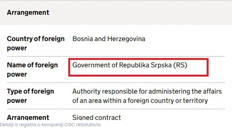 Prema informacijama koje smo pronašli u registru, RS je angažovala kompaniju CGC reSolutions LTD s ciljem da” otvori, razvije novi, diskretni kanal komunikacije između Vlade RS i vlasti Ujedinjenog Kraljevstva kako bi se omogućilo bolje razumijevanje politika RS i uključivanje RS u dijalog s ciljem osiguranja obostrano korisnih ciljeva u okviru Dejtonskog mirovnog sporazuma ili bilo kojeg naknadnog sporazuma za Bosnu i Hercegovinu”.