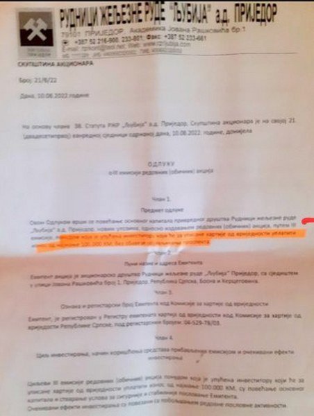 Prenosim u cjelosti pismo koje sam dobio od zabrinutih građana Ljubije i Prijedora, koji ukazuju na zloupotrebe i nezakonitu prodaju akcija Rudnika željene rude Ljubija kontroverznim „biznismenima“ i tašna-mašna firmi sa virtuelnim sjedište i adresom u Njujorku. Po Zakonu akcije se nisu mogle prodavati ispod nominalne vrijednosti, koja trenutno iznosi 1,68 KM, pa je i zbog tog, kao i netransparentnosti, odlučivanja mimo Narodne skupštine Republike Srpske i drugih zloupotreba, prodaja akcija i Rudnika RŽE Ljubija nezakonita. Pročitajte pismo koje sam dobio iz Ljubije u kome se ukazuje na nezakonito postupanje.