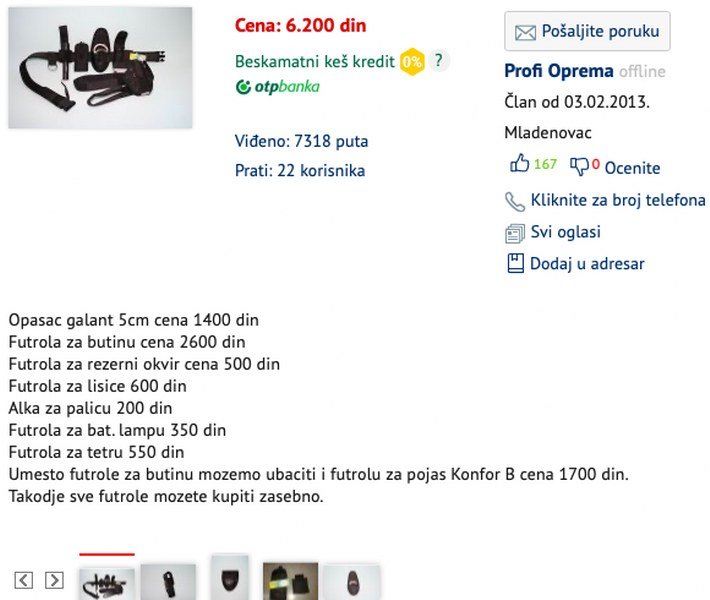 7. Riječ je o bezočnoj pljački, jer komplet opasač za policiju (vrhunska profesionalna oprema i to najskuplja), zajedno sa futrolom za pištolj (plus četiri dodatne futrole za razne namjene) i alkom za palicu, košta 53 evra ili 103 KM.