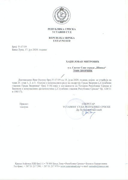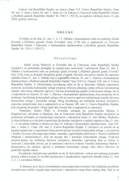 Ustavni sud Republike Srpske donio je, 15.07.2020., Odluku kojom je utvrdio da se član 21. stav 1, 2 i 3 Odluke o komunalnom redu na području Grada Zvornik (Službeni glasnik Grada Zvornika broj 3/18) nije u saglasnosti sa Ustavom RS i Zakonom o komunalnim djelatnostima (Službeni glasnik RS Broj 124/11 i 100/17).