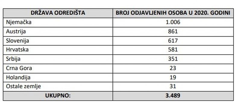 Prema njihovim podacima, u 2020. godini, 3.489 osoba je odjavilo boravak u Bosni i Hercegovini.17 Kada se posmatra polna struktura podjednak je broj muškaraca i žena koji odjavljuju boravak u Bosni i Hercegovini (1.748 muškaraca i 1.740 žena).